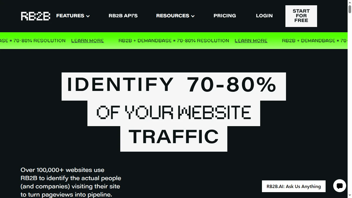 RB2B is a website visitor identification tool that tells you exactly which person is browsing your site — not just which company. It matches US-based visitors to LinkedIn profiles, pulls their contact details, and sends real-time alerts to Slack. The pitch: stop guessing which companies visit your site and start knowing which individuals are looking at your pricing page.